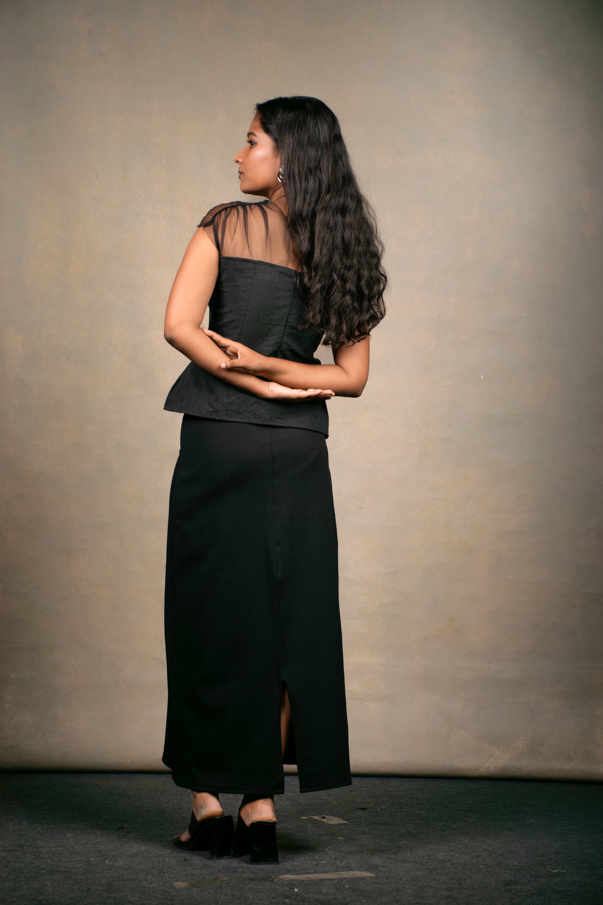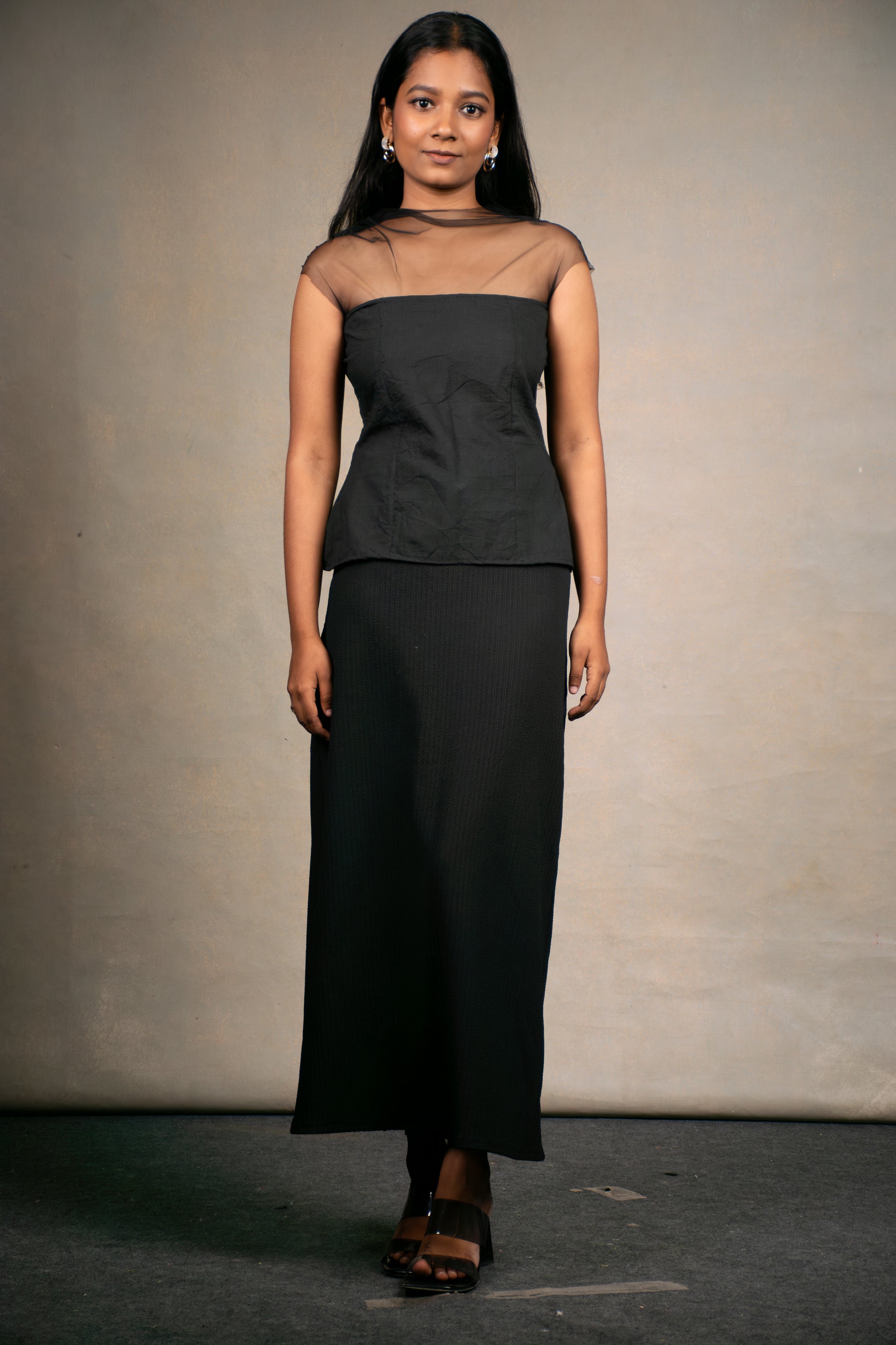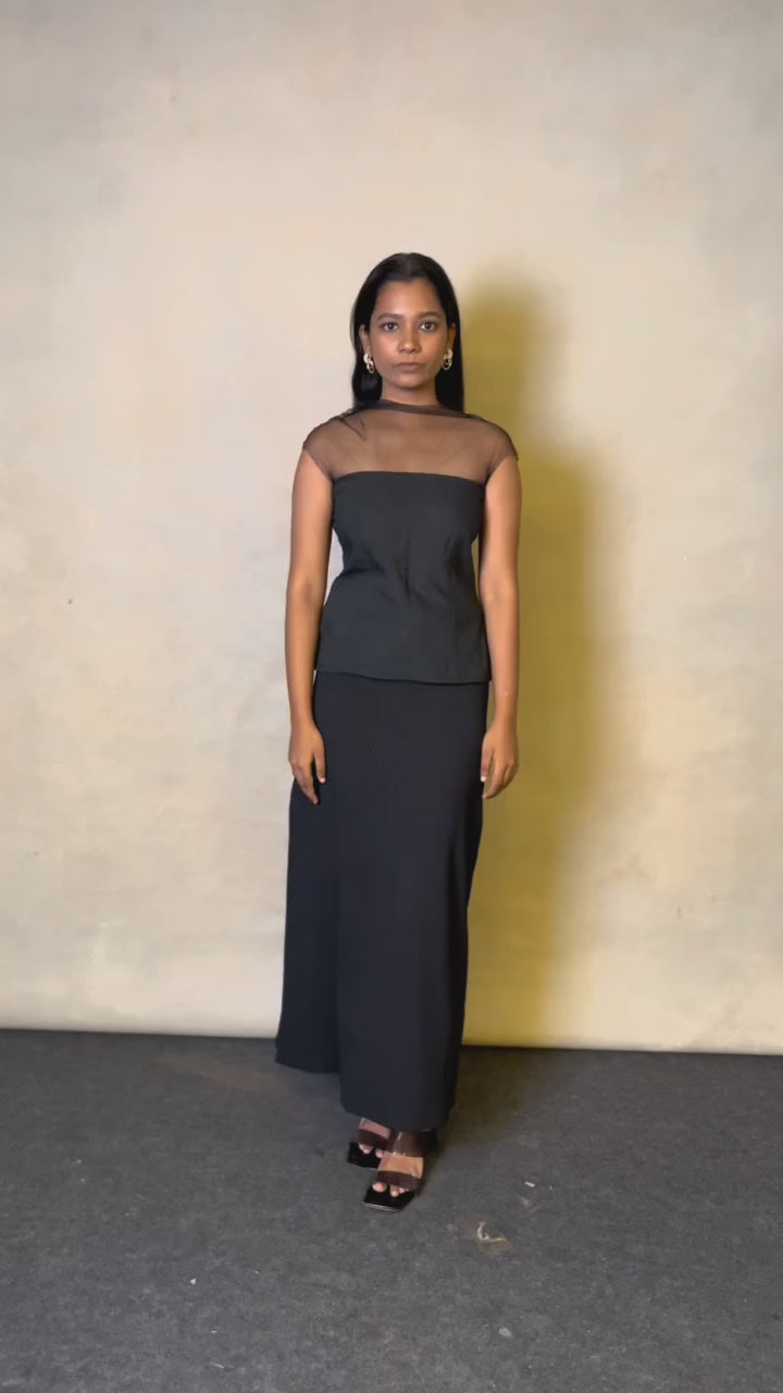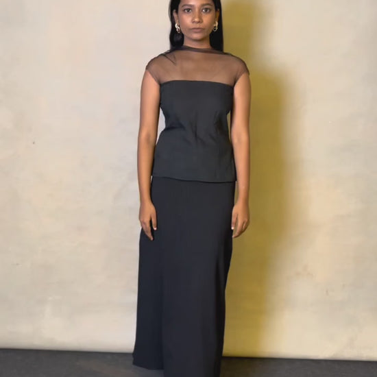 This elegant sheer neck black top blends sophistication with a modern edge. Designed with a delicate transparent mesh neckline and a structured bodice, it offers a sleek and flattering fit. Perfect for pairing with skirts or trousers, this top adds a touch of effortless class to any evening or formal look.