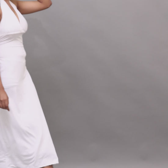 This elegant maxi dress features a halter neckline with a flattering, body-hugging fit. Crafted from soft malai lycra fabric, it offers comfort and a graceful flow, perfect for evening outings, parties, or special occasions. The white shade adds a timeless and sophisticated appeal.